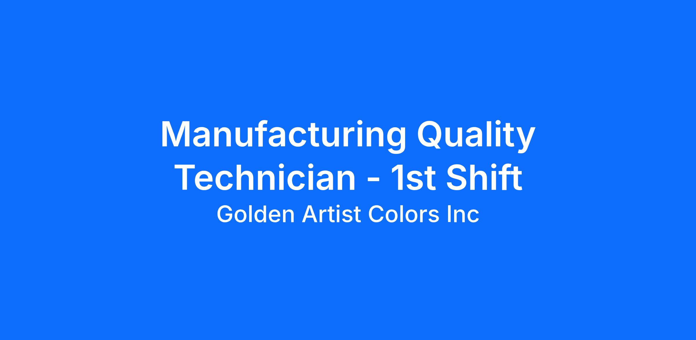 Do you want to work for a World Class Artist Materials Manufacturer?Leave “corporate” behind and unlock your passion for ingenuity in a mission-based, creative culture where doing well and doing good are one and the same. Golden Artist Colors is a world-class art materials manufacturer bridging creative communities and inspiring global change through the arts. We do this by building our world-class brands of professional artist paints and by supporting the arts with partners who share our values and mission. Who are we?Golden Artist Colors is a manufacturer of art materials revered by professional and aspiring artists across the globe. Employee-owned and based in Central NY, the company’s mission is to grow a sustainable company dedicated to creating and sharing the most imaginative and innovative tools of color, line, and texture for inspiring those who turn their vision into reality. We prize the opportunity to support community engagement by employing the best employees dedicated to safety, quality, and long-term service. Our portfolio includes the well-established GOLDEN Artist Acrylics brand, which has set the standard for professional quality acrylic paints since 1980. We maintain the Williamsburg Artist Oils brand, which was acquired in 2010. QoR Artist Watercolors were created by GOLDEN in 2014, and most recently PanPastel Artist Pastels and Sofft Tools were acquired by GOLDEN in 2022. Our portfolio also includes Golden Paintworks, a division focused on specialty architectural products. Golden Artist Colors is seeking a:Position Title: Manufacturing Quality Technician **1st shift**Location: New BerlinSupervisor: Manufacturing Quality SpecialistDepartment: OperationsPay Range: $22.69/hour to $28.37/hour**Monday through Thursday 6am to 4:30pm**Responsibilities:The Manufacturing Quality Technician (MQT) will be completing inline quality audits, quality inspections, dispositioning materials, and driving corrective actions. This position will assist the Manufacturing Quality Specialist (MQS) with addressing quality issues, drafting/updating Standard Operating Procedures (SOP), and assisting in the development of a supplier quality system. The MQT will be responsible for testing and monitoring physical samples/materials in accordance with quality standards to ensure compliance; this includes incoming materials, work in process (WIP), and finished goods. The position will be documenting, communicating, and tracking quality statuses, maintaining documentation systems, creating and maintaining SOPs, and ensuring quality control is maintained within all areas of Operations. The MQT must possess knowledge of manufacturing processes and procedures, manufacturing quality, possess excellent computer skills, and the ability to analyze and present technical information using strong communication skills. The MQT must be self-motivated and be able to engage across multiple projects.Requirements:High School Diploma Understanding of supplier and manufacturing/process qualityEye for detailAbility to lead self-guided projectsAbility to identify issues and develop processes and controls to correct themData logging processing, and presentations of inspection resultsProficient in Microsoft Office products such as Work, Excel, PowerPoint, and Outlook Experience in usage of ERP systemsUse hand tools such as micrometers and calipersAbility to read and interpret blueprints and drawingsOur extensive benefits package includes: Employee Stock Ownership Plan (ESOP). Medical, Dental, and Vision Insurance401(k) with Employer matchNo-cost Life Insurance and Long-Term Disability BenefitsPaid Holidays and Time OffQuarterly bonus for the purpose of distributing to employees a share of profits as additional remuneration over and above regular wages or salaries. Wellness Reimbursement ProgramContinuing Education ReimbursementChild Care ReimbursementPaid Community Service Hours Employee Discount on ProductEmployee assistance programReferral Bonus program EEO: Golden Artist Colors is an equal opportunity employer committed to a culturally diverse workforce. All qualified applicants will receive consideration for employment without regard to race, religion, color, age, sex, national origin, sexual orientation, gender identity, disability status or protected veteran status.