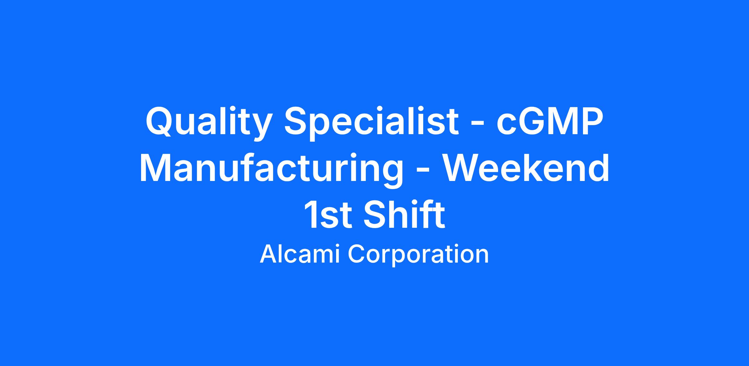 At Alcami, we deliver reliable solutions that unlock the potential of transformative medicines from discovery to commercialization, through trusted partnership with our clients, recognized industry expertise and proven regulatory track record. Are you interested in joining our team? Job Summary The Quality Specialist will provide site quality support in a fast-paced environment by effectively performing activities of substantial variety to ensure quality and compliance with applicable regulatory requirements and is proficient in all document and protocol approvals applicable to the respective processes executed at the respective lab or manufacturing facility. Activities include reviewing documents and data, supporting audits and inspections, consulting on quality and compliance issues, maintaining quality databases and performing trend analysis where needed, and performing quality and compliance training as needed. The position develops SOPs or other quality documents as needed. On-Site Expectations 100% on-site position.1st Shift: Friday - Monday, 6:00am - 4:30pm. Responsibilities Performs quality review and approval of complex documents, all types of data, protocols, and/or reports.Supports quality floor audits and/or floor inspections.Supports for client and regulatory agency audits and inspections.Provides quality evaluation and release of support materials, products, equipment and facilities as required.Maintains quality databases and may perform analysis and trending.Assists with quality improvement initiatives as needed.Develops quality SOPs or other quality documents and/or reports as needed. Provides consultation on complex quality and compliance topics in areas of expertise.Develops and provides training in quality and compliance topics in areas of expertise.Provides Quality oversite for the site specific Quality Management Systems including Investigations, Corrective Actions, Change control, etc.Effectively performs a variety of complex duties, on schedule, with accuracy and competency.Maintains accurate files and records.Ensures timely completion and compliance with cGMP and all other relevant company training requirements.Other duties as assigned. Qualifications Bachelor’s degree in Chemistry, Biology, or relevant field and 3+ years of related experience required, or Master’s degree in relevant field and 1+ years of related experience.Relevant GMP experience required.Experience in Environmental monitoring and critical utilities preferred for sterile operations. Knowledge, Skills, and Abilities Strong knowledge of regulations and SOPs applicable to area of responsibility and keeps abreast of new regulations and regulatory guidance in areas of expertise.Good written and oral communication skills.Good math skills.Good computer skills and knowledge of Microsoft Office products.Ability to be trained and to mentor.Ability to act independently.Ability to interact well with clients and regulatory agents.Ability to negotiate.Ability to interact well with employees at all levels.Ability to act as technical consultant.Uses professional concepts and company policies and SOPs to solve a variety of problems.Receives minimal instruction on day-to-day work, general instructions on new assignments. Travel Expectations Up to 5% travel required. Physical Demands and Work Environment The physical demands and work environment characteristics described here are representative of those that must be met by an employee to successfully perform the essential functions of this job. Reasonable accommodation may be made to enable individuals with disabilities to perform the essential functions. While performing the duties of this job, the employee may be required to use hands to finger, handle, or feel and to reach with hands and arms. The employee is required to talk and hear. The employee is frequently required to stand, walk and sit. The employee may be occasionally required to climb or balance.The employee may be required to regularly lift and/or move up to 10 pounds, frequently lift and/or move up to 25 pounds and occasionally lift and/or move up to 50 pounds. Specific vision abilities required by this job include close vision, distance vision, and peripheral vision. While performing the duties of this job, the employee may be occasionally exposed to moving mechanical parts, high precarious places and vibration. The noise level in the work environment is usually quiet. The employee may be required to gain access to lab, or manufacturing areas for inspections or work discussions. The noise level in these additional work areas may be louder. The employee is required to wear the appropriate personal protective equipment to perform the job duties. Such personal protective equipment may include but is not limited to safety eyewear, various types of respirators/breathing apparatus, lab coats, gloves, etc.