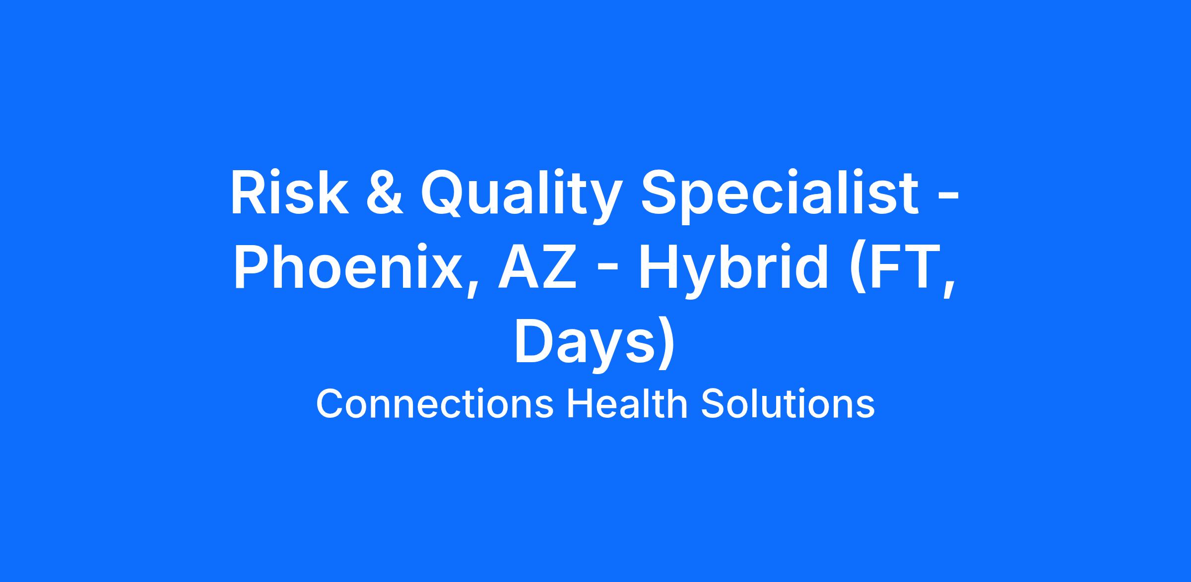 Overview We’re not just behavioral health people—we’re crisis people. Connections Health Solutions is a leading provider of immediate-access behavioral health crisis care. Our team combines medical and recovery-oriented treatment to stabilize individuals in crisis and connect them to community-based resources for ongoing recovery. Founded by emergency room psychiatrists Dr. Chris Carson and Dr. Robert Williamson, our model is physician-led and data-driven, drawing upon more than 15 years of crisis care expertise. Recognized by SAMHSA and the National Council for Mental Wellbeing as a national best practice, we’ve delivered invaluable treatment to hundreds of thousands of individuals facing crises. Our commitment remains consistent, to improve access, inspire hope, and provide the right support. Our values shape our decisions, define our culture, and foster continuous learning and growth. We accept people as they are, creating safe spaces where they feel valued and respected. We inspire hope by walking with people side-by-side, showing them grace and compassion. We act with intention, holding ourselves and each other accountable, and doing the right thing. We work as one team, trusting and supporting each other. We embrace change and innovation, striving to find better ways to fulfill our mission. We are on a mission to change the face of behavioral health. Help us save lives and make a difference. Responsibilities What You'll Do: The Risk & Quality Specialist works in collaboration to coordinate, administer and oversee the onsite quality and risk management programs. This role will manage, analyze and interpret both risks and performance data to drive key performance measures (KPMs), provides risk and quality education, and comply with Joint Commission standards and other regulatory agencies, with the goal of enhancing and promoting recipient safety, quality of care and minimizing losses to the organization. Acts as the Quality Improvement and Risk Management subject matter expert at the site(s), and within committees and associated workgroups.Serves as a point of contact for investigation, resolution, and response of internal recipient and external (i.e., Health plan) complaints. In addition, may coordinate with the Director of Licensing and Accreditation on responses to complaints received from the Joint Commission or other Regulatory agencies.Works with the site-based staff and facilities to ensure all incidents are documented and reported as required to external regulatory bodies.Leads initiatives, in collaboration with site leadership and national Quality leadership, that support improvement of organizational processes for clinical care delivery, business operations and administration.Works in conjunction with all necessary individuals and departments in the investigation of potential or actual events concerns, including the auditing of seclusion and restraint footage when necessary. Coordinates and participates in root cause analysis investigations as appropriate.Exercises discretion and independent judgement on identifying opportunities for improvement and driving performance outcomes, this includes identifying opportunities to prevent, reduce, and control loss to the organization, its patients, visitors, and employees. Coordinates with leadership to develop strategies, implement practices, and assists with the creation policy to address the identified areas of improvement.Coordinates, tracks, and monitors performance and process improvement outcomes, as well as data tracking and trending analysis.Completes and documents facility inspections every 6 months, or as needed, to identify areas of risk and/or improvement to ensure compliance with regulatory/accreditation standard.Coordinates with the appropriate departments regarding site visits or audit requests from state Health regulatory agencies or accrediting bodies.Communication with state regulators, when needed, to inquire about state-specific requirements.Assist with creating policies to reflect company vision and mission under direction and in collaboration with department leadership.Stays abreast of the latest developments, advancements, and trends in the field.Performs all other duties as assigned. Qualifications What You'll Bring: Associate degree, plus one (1) year of experience with Quality and/or Risk in a healthcare setting, orHigh school diploma, plus (2) years of experience with Quality and/or Risk in a healthcare setting.Requires the ability to manage, communicate, and negotiate in challenging situations, with sensitivity to operations and the culture of facility/organization.Advanced capability with Microsoft Excel and other reporting software and demonstrated proficiency in using verbal and written skills to clearly communicate complex information to regulators and staff.Self-motivated in managing competing priorities in a timely manner.The Company has a mandatory vaccination policy. All successful applicants must be fully vaccinated, including showing proper documentation, or otherwise be exempt pursuant to the Company’s exemption process prior to their start date as a condition of employment.State of Arizona Fingerprint Clearance Card.It would be nice if you had: Bachelor’s Degree2 years of experience with Quality and/or Risk in a healthcare settingCertified Professional in Healthcare QualityExpert in Microsoft Excel and/or proficiency with SQLWhat We Offer: Full-time only:Employees (and their families) are offered comprehensive health insurance, including Medical, Dental, Vision, Accident, Critical Illness, and Hospital IndemnityCHS pays for Basic Life, AD&D, Short and Long-Term DisabilityVoluntary Life insurance option for employees and their familiesHealth Savings Accounts (with $1,000 to $2,000 employer contribution depending on plan)Flexible Spending Accounts (health care and dependent care)401k company match after 6 months (50% of deferrals up to 6% of compensation)Generous PTO starting at 160 
