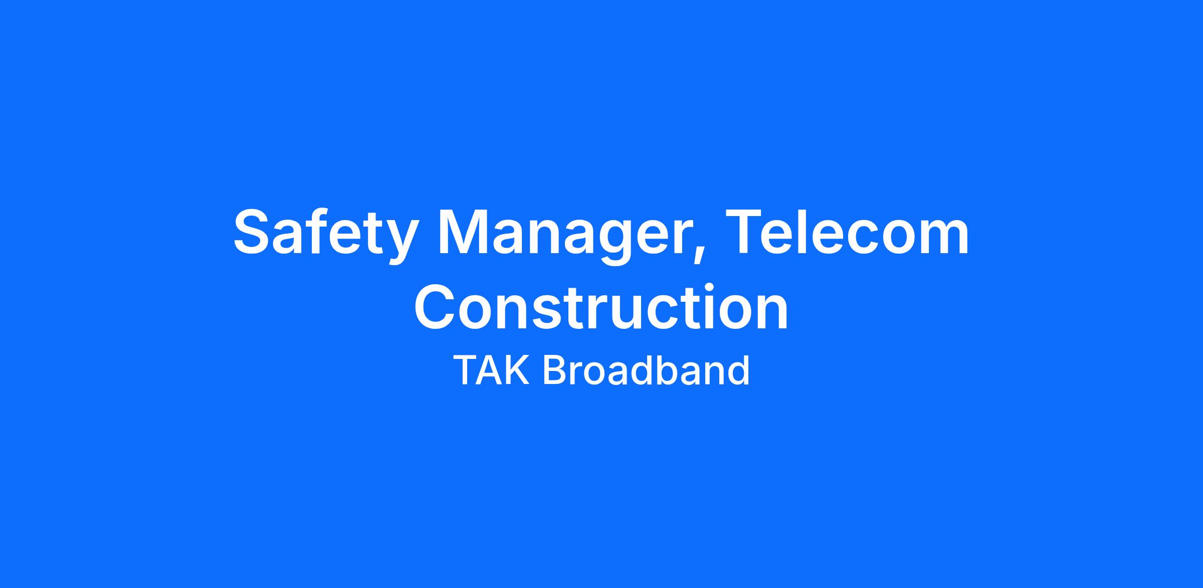 Full-time Description TAK Broadband is a leading end-to-end U.S. fiber broadband network construction contractor operating in 42 states. It builds more than just networks; it connects communities to new valuable digital opportunities. TAK offers comprehensive service solutions, from construction to drops to fulfillment. TAK’s ecosystem of partners allows it to successfully complete every project starting from the first point of conception. This includes engineering teams, distributors, and more than 100 qualified construction crews with extensive experience across all ISP types and markets; over 300 experienced bury drop crews; and more than 700 professional technicians.We are seeking a Safety Manager to join our team. In this role you will be responsible for implementing and managing safety and regulatory compliance programs for fiber construction and telecommunications operations throughout our CA markets. This role ensures compliance with CA/OSHA and related regulations while supporting injury and incident prevention across project planning, field operations, and contractor oversight. The Safety Manager works closely with field leadership to promote safe work practices and strengthen a prevention-focused safety culture on high-risk construction projects.Why TAK?Full TimePaid Bi-WeeklyCompensation: $85K - $100K annually, DOEFull Benefits Package (Medical, Dental & Vision)Paid Time Off401(k) with Company Match!25K Company Paid Life InsuranceIndependent Work & Team CollaborationCareer Development & Advancement Opportunities!The RoleImplement, maintain, and enforce company safety programs in compliance with Cal/OSHA Title 8, OSHA 29 CFR 1910/1926, and California Labor Code requirementsMaintain the Injury and Illness Prevention Program (IIPP) and site-specific safety plansSupport Cal/OSHA inspections, audits, and regulatory inquiries, including documentation and corrective action follow-upProvide safety support for multi-site fiber construction projects, including underground and aerial installationEnsure compliance and safe work practices for high-hazard activities, including confined space entry, excavation and trenching, overhead and underground power line safety, traffic control, and electrical safety (NFPA 70E)Verify completion and adherence to Job Hazard Analyses (JHAs), Activity Hazard Analyses (AHAs), and pre-task plansConduct routine and unannounced field safety inspections and audits; partner with field supervision to correct unsafe conditions and reinforce safe behaviorsParticipate in project planning, design reviews, and pre-construction meetings to integrate safety requirementsSupport incident and near-miss investigations, root cause analysis, and corrective action trackingTrack safety metrics and trends and recommend improvements to reduce risk and prevent incidentsAssist with contractor and subcontractor safety prequalification, onboarding, and compliance monitoringTravel regularly to active construction sites throughout California and safely access jobsite environments, including excavations and right-of-way work areas (+/- 50% annually) Requirements 3-5 years or more of safety experience in telecommunications, utilities, or heavy civil construction requiredBachelor’s degree in safety, environmental health, engineering, or a related field, or equivalent experienceAble to travel to various job sites throughout Northern & SoCal (+/- 50% annually)Strong working knowledge of Cal/OSHA Title 8 and California construction safety requirementsHands-on experience supporting high-hazard construction activities, including confined space, excavation/shoring, and power line safetyAbility to work independently across multiple job sites and collaborate effectively with field and project leadershipSafety certifications such as CHST, CSP, CIH, or equivalent are preferredExperience supporting large-scale fiber construction programs and working in union or multi-employer environments is a plusMust provide a valid government-issued photo ID for verification; a driver’s license is required if the role involves drivingPassing of all pre-employment requirements (MVR, Background Check, Drug Screen)The compensation and benefits information is accurate as of the date of this posting. The Company reserves the right to modify this information at any time, with or without notice, subject to applicable law.TAK is an Equal Opportunity Employer. All qualified applicants will receive consideration for employment without regard to race, color, religion, sex, sexual orientation, gender identity, national origin, age, disability, genetic information, protected veteran status, or any other characteristic protected by law. We maintain full compliance with the Americans with Disabilities Act and are committed to providing equal access throughout our employment practices. Individuals with disabilities may request reasonable accommodations during the application and hiring process by contacting TAKRecruiter@takbroadband.com. Salary Description $85K - $100K annually, DOE