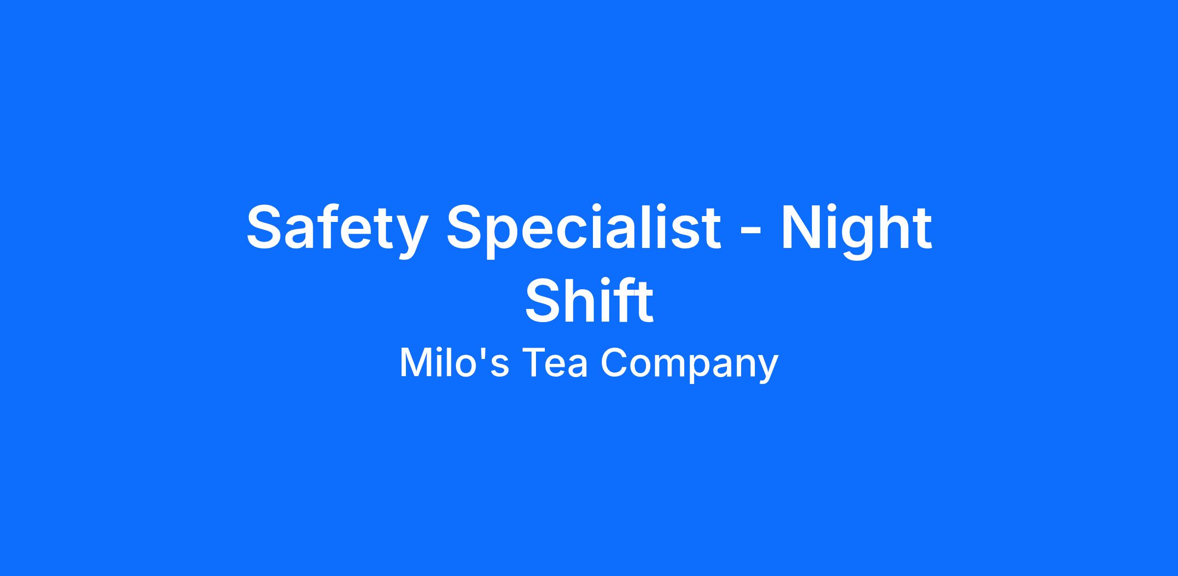 Overview Company OverviewMilo’s Tea Company is one of the fastest growing beverage companies in the US. Our culture and operations are built on the belief that we can make a difference in the world. That’s why we put People First and strive to continually reduce our environmental impact on the planet. We leverage our world class operations and decades-long distribution partnerships to grow the footprint of our core products and create new, innovative beverage products. We are the #1 and fastest growing brand in the Refrigerated Tea Category in the nation.Our core mission is that we put people and the planet first and by doing this, it will be good for our business.We are committed to unlocking the personal genius of every associate and have a strong focus on growth and learning.Our Company is women-led and strongly committed to Diversity, Inclusion and Belonging.We are committed to annual charitable giving by delivering upon our 1% profit pledge.We are Platinum Certified in Zero Waste Manufacturing; recycling, reducing, and reusing 95% of waste at all facilities. Being a part of the Milo’s TEAm, you’ll get to collaborate with a group of passionate and high-performing people, where everyone feels empowered to do their best work and feels good about the work they’re doing. And as a "People First" company, Milo’s is committed to the success and well-being of our associates, customers, and fans, no matter their gender, race or creed. Some of the great things offered that reflect our commitment include:Competitive salary with bonus opportunities for various roles100% employer paid medical premium for our associates and their familiesFree Mental Health, Financial Wellness, and Legal Counseling benefits401K with a company matchCompany paid Life InsuranceTuition reimbursement assistanceContinuous learning opportunities through various platforms and resourcesA robust parental leave programCare Relief Fund to help Associates in needAssociate Assistance ProgramPaid volunteer time Position SummaryImplement the compliance aspect People Based Safety in each manufacturing facility. The safety specialist will use proactive safety techniques to ensure compliance. *This position is for night shift/weekends. ResponsibilitiesCoordinate employee safety training with Operations management.Conduct daily safety and health walk-through inspections of workplace facilities.Implement and facilitate proactive and compliance safety training plans and content objectives.Complete facility inspections and participate in producing corrective actions.Participate in the completion of job hazard analysis.Develop and evaluate eight step procedures for energy control.Serve as coordinator for the Safety Committee .Prepare injury/illness and noninjury incident investigation reports and follow up as necessary.Other responsibilities as necessary. QualificationsBachelor’s or Associate’s Degree required, at least 1-3 years of relevant full-time work experience or a relevant combination of both. Direct training experience is highly desirable. Strong process orientation and ability manage multiple priorities.Superior interpersonal and communication skills with a demonstrated ability to lead group discussions and build knowledge.Excellent organizational skills and computer proficiency in MS Office required. Physical DemandsWhile performing the duties of this job, the employee is regularly required to use hands to handle, reach with hands and arms, see, talk and hear. The employee is required to stand, walk, stoop or kneel. The employee must regularly lift and/or move up to 50 pounds. Specific vision abilities required by this job include close vision.While performing the duties of this Job, the employee is regularly exposed to moving mechanical parts and to wet and/or humid conditions. The employee is occasionally exposed to extreme cold. The noise level in the work environment is usually very loud. All applicants must have the ability to stay at work station and area for three continuous hours.The physical demands and work environment characteristics described here are representative of those that must be met or that an employee may encounter while performing the essential functions of this job. Critical CompetenciesBuilding RelationshipsHumilityCoachable/Open to FeedbackTeamworkCoaches & Develops